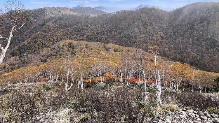 金精峠から金精道路方面を俯瞰した様子です。ダケカンバの黄葉が始まりだしています。