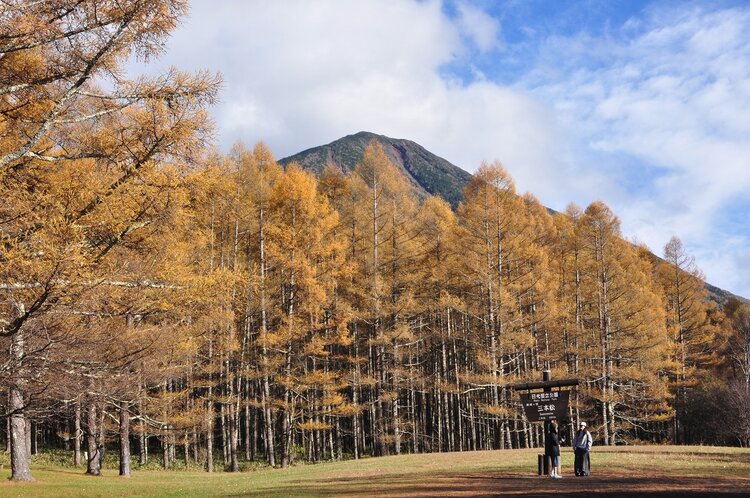戦場ヶ原三本松園地ではカラマツの黄葉の向こうに男体山が望めます。