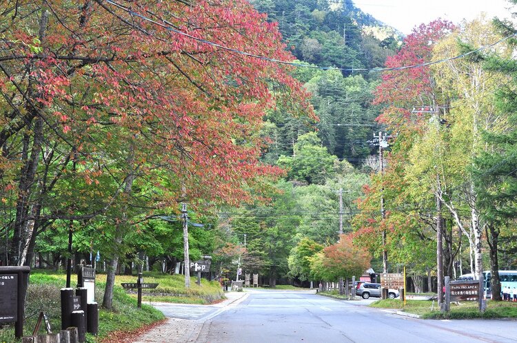 湯元駐車場の様子です。カエデの紅葉と背景の山の黄葉、針葉樹の深い緑が混ざり合い、美しいです。