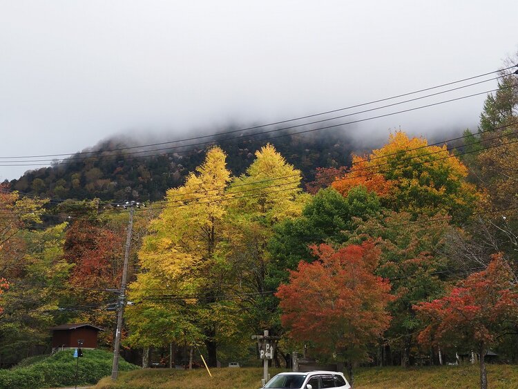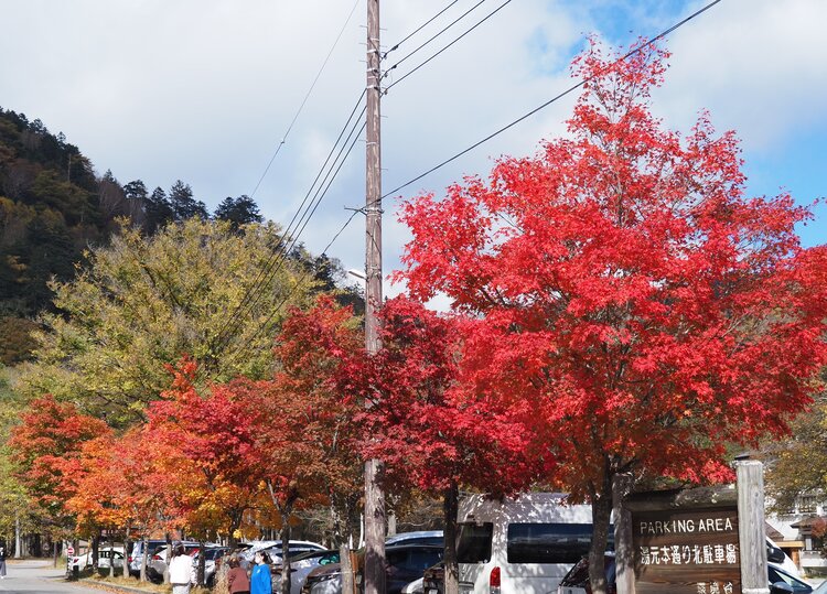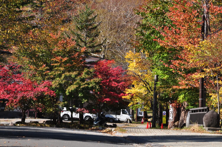湯元北駐車場のカエデが見頃です!こちらは湯元内の他の場所よりも色づきが遅いため、まだほとんど落葉せずボリューム感も充分です。
