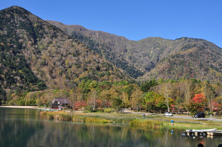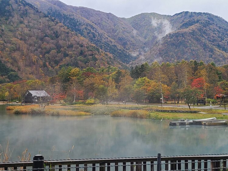 湯ノ湖畔の木道から見た湯元は、背景の山々とともに紅葉をワイドに楽しめます。