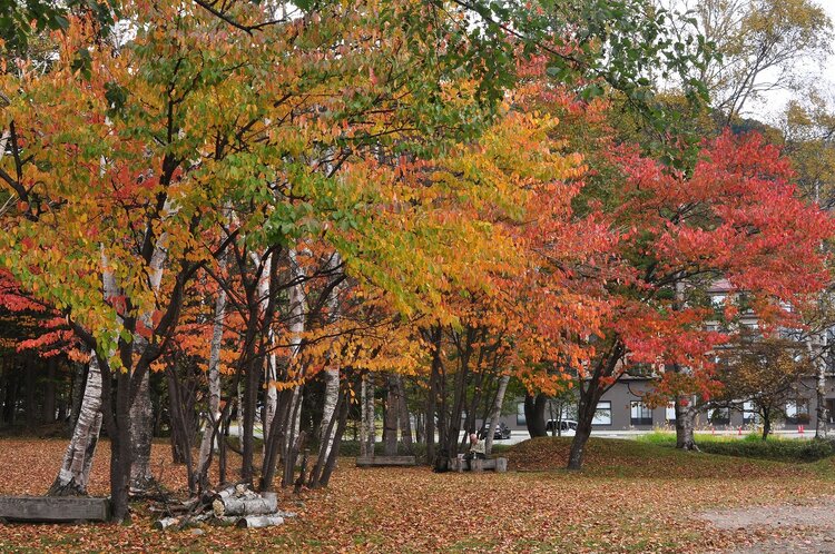 湯ノ湖近くの園地ではオオヤマザクラ、シラカンバ、カツラの紅葉が美しいです。