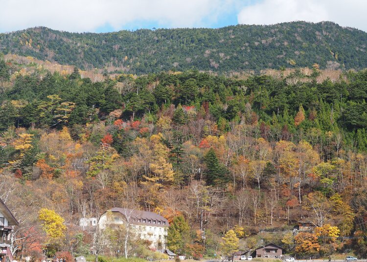 湯元スキー場とホテル樹林さんの間の木々が鮮やかに色づいています。湖畔だけでなく温泉街もゆっくり散策して、お気に入りの場所を探してみてください。