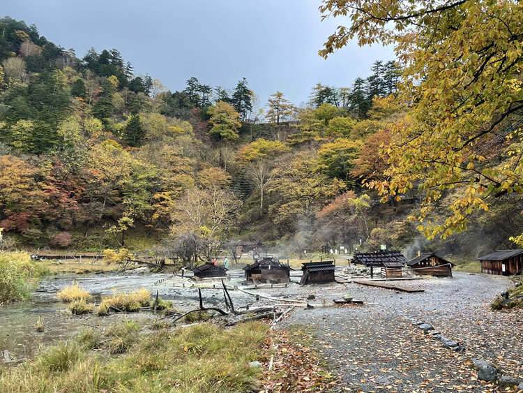 湯元ではほぼ落葉していますが、カラマツの黄葉を楽しめます。
