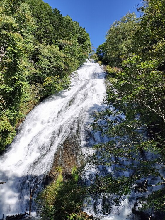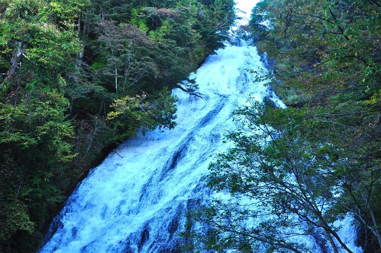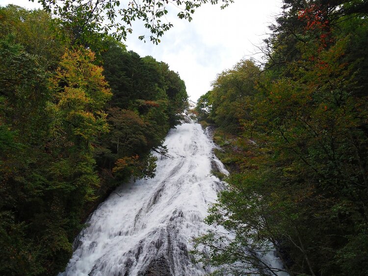 湯滝の周りの木々は一部紅葉している葉がありますがまだ緑が多いです。湯滝は年間を通して水量が一定しているため迫力のある姿を目の当たりにすることができます。