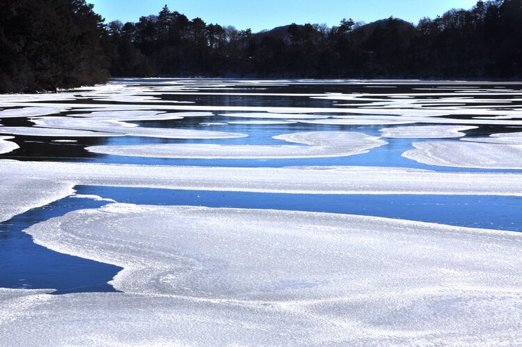 ここ数日湯元では最低気温がマイナス10度を下回り、最高気温も0度に満たない真冬日が続き湯ノ湖も一部を除き結氷しています。 湯ノ湖は結氷すると雪が降り積もり真っ白な平原と化しますが、今日の湯ノ湖は不思議なまだら模様が広がっていました。 昨夜は粉雪とともに風が強く、稀にしか現れない雪と氷が織りなす幻想的な湯ノ湖でした。