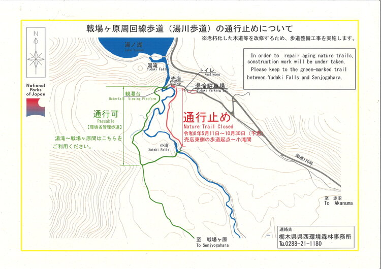 戦場ヶ原周回線歩道(湯川歩道)(湯滝~小滝間)が、歩道整備工事のため下記の日程で通行止めとなりますので、お知らせいたします。区間:売店東側~小滝間期間:令和8年5月11日~令和8年10月30日(予定)※湯滝観瀑台~迂回路~小滝間は通行可能です。詳細は添付の画像もご覧ください。問い合わせ先:栃木県県西環境森林事務所Tel:0288-21-1180