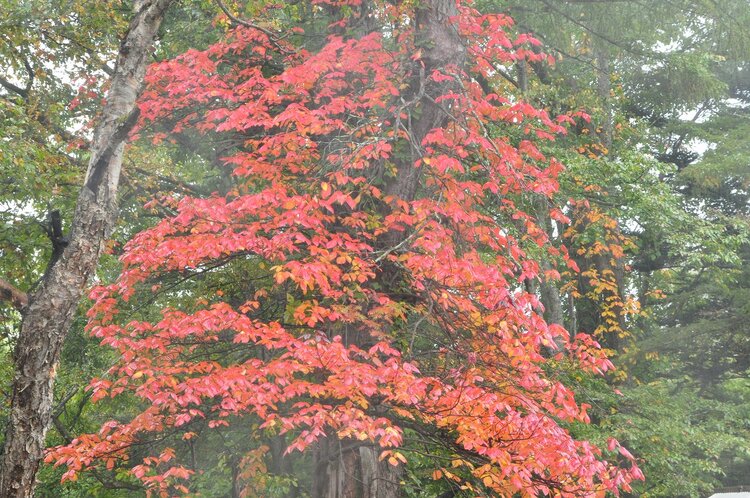 ツタウルシの赤色が目立ってきました。シラカンバやオオヤマザクラ、シウリザクラなども紅葉しだしています。