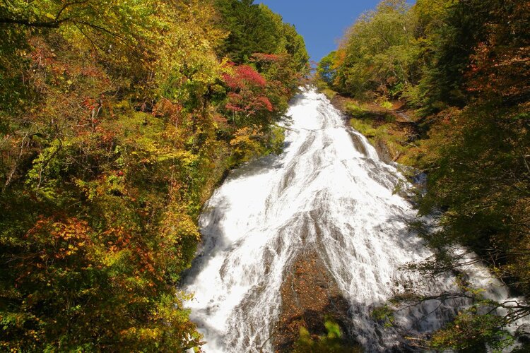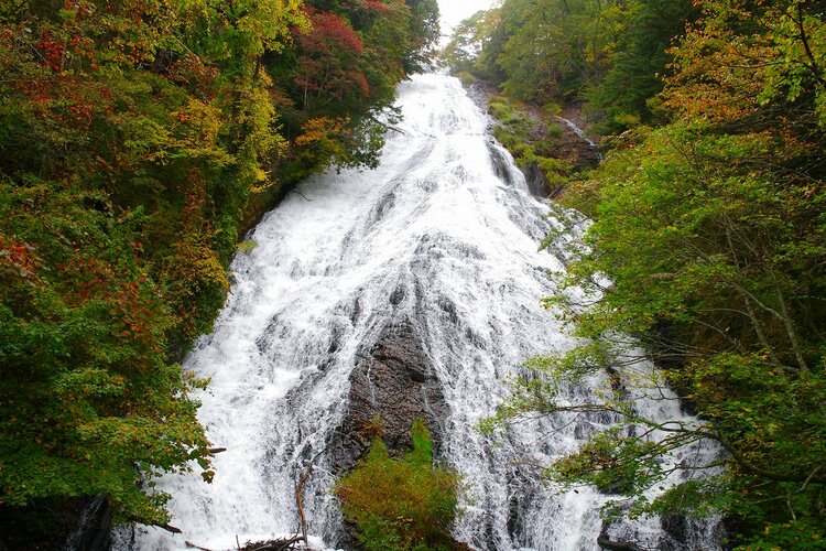湯滝の周りの木々は一部紅葉している葉がありますがまだ緑が多いです。湯滝は年間を通して水量が一定しているため迫力のある姿を目の当たりにすることができます。